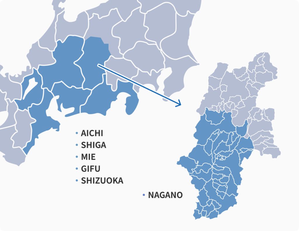 愛知・滋賀・三重・静岡・岐阜・長野の一部を含むエリアで提供し、地域と社会に貢献し続けます。